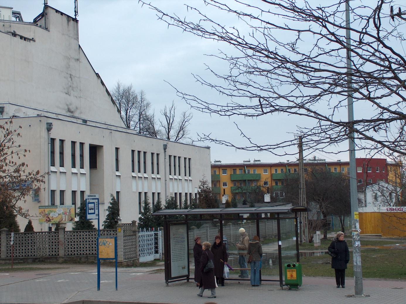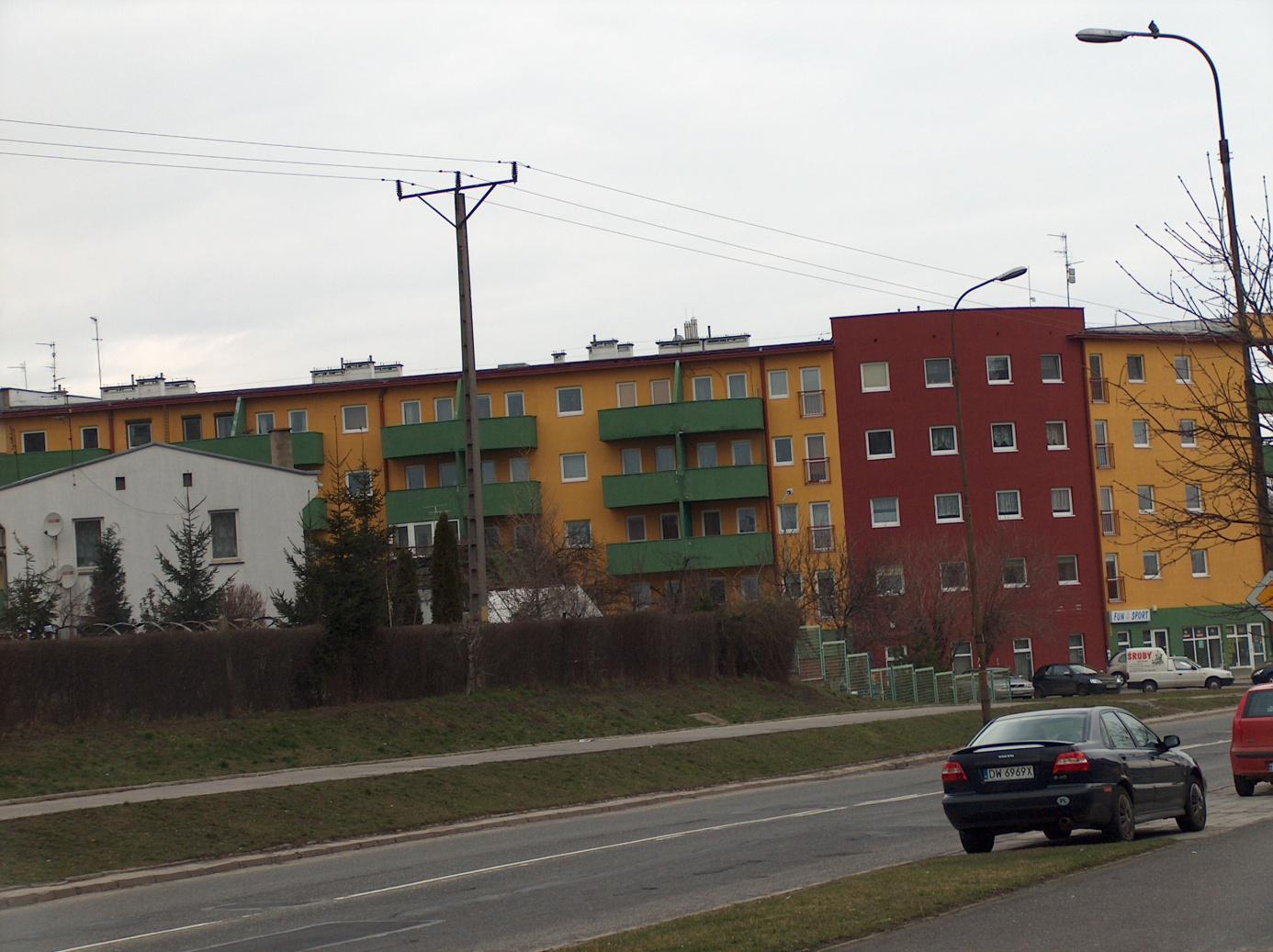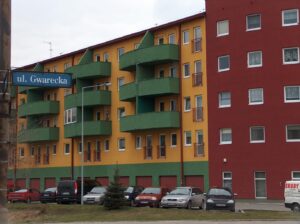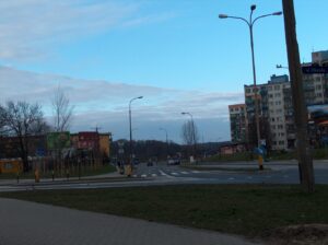 Ulica Gwarecka i budynek po lewej stronie, w którym mieści się nauka jazdy.