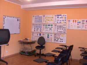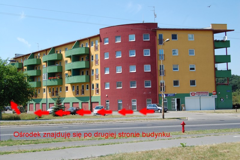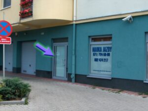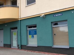 udynek, w którym mieści się nauka jazdy na parterze z drugiej strony budynku.
