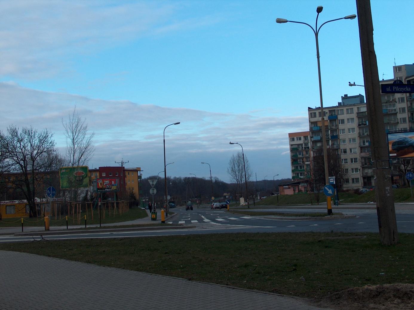 Po lewej stronie kościół a na wprost za kościołem pomarańczowy budynek, w którym mieści się nauka jazdy (na parterze z drugiej strony budynku)